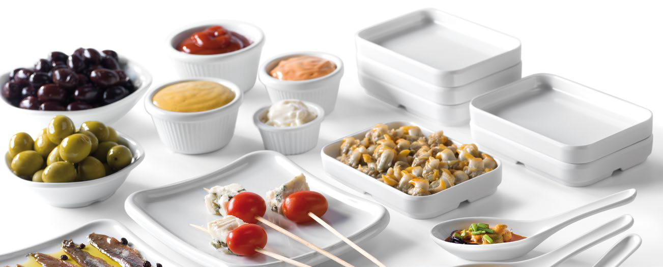 - Gama Buffet: Bandejas rectangulares y cuadradas de diversos tamaños, diseños y colores.