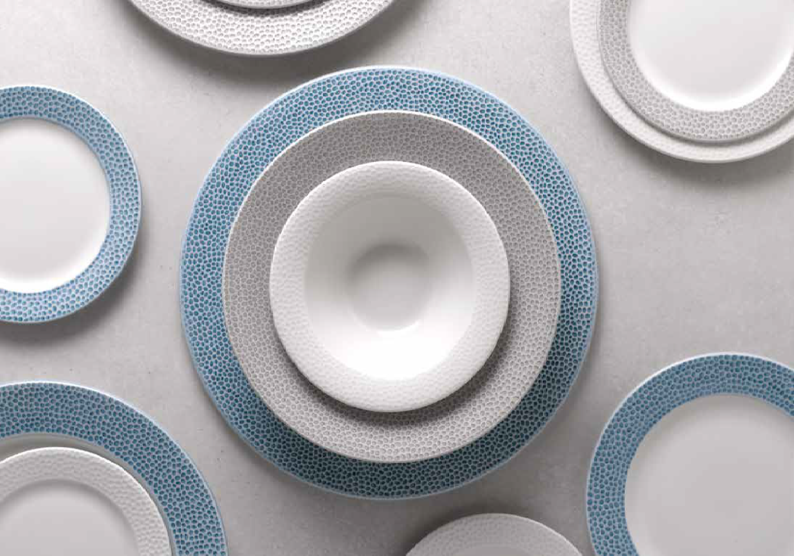 • Isla. Presenta un diseño con relieve texturizado inspirado en la naturaleza y en la cerámica de la vajilla Isla, es moderna, delicada y su superficie crea sombras y reflejos acentuando las formas.