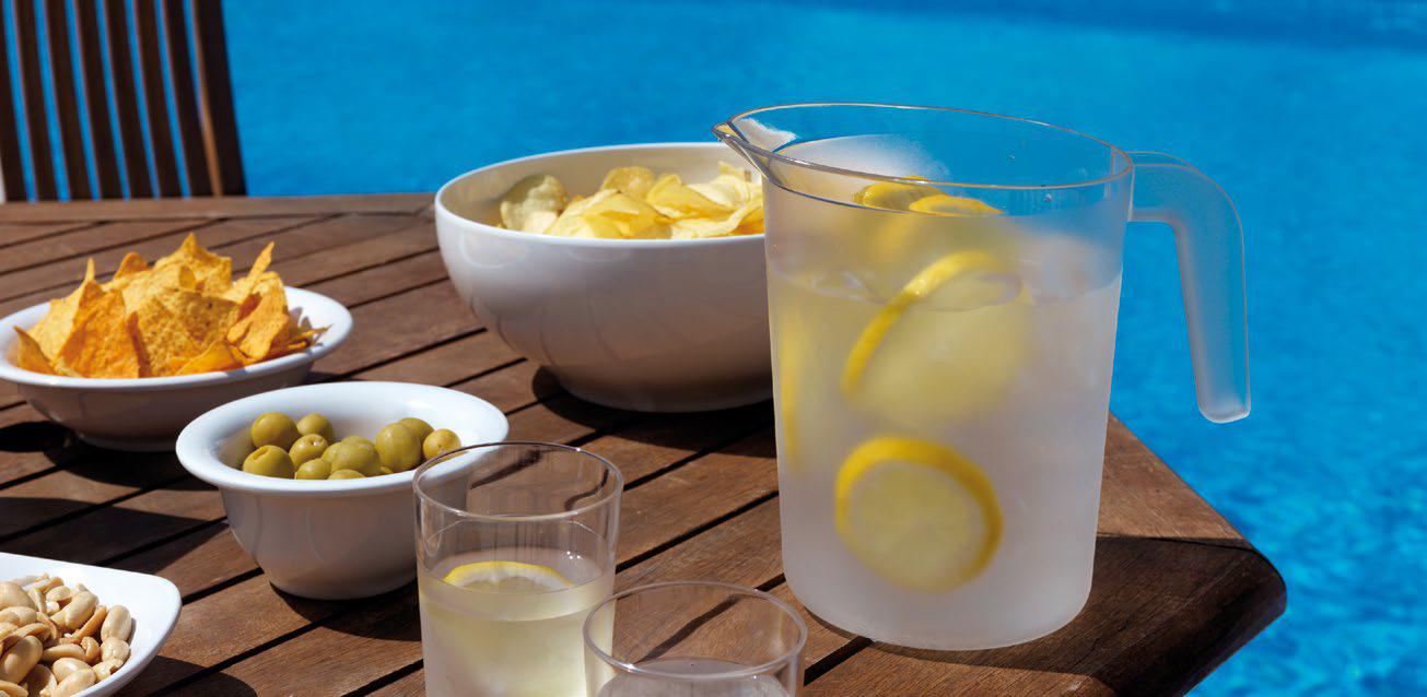 Vasos y jarras que imitan el aspecto y la claridad del vidrio, con la diferencia de la resistencia y el peso. Su apariencia hacen de ellos una opción elegante para las comidas y cenas casuales, los eventos al aire libre o para el servicio junto a la piscina.