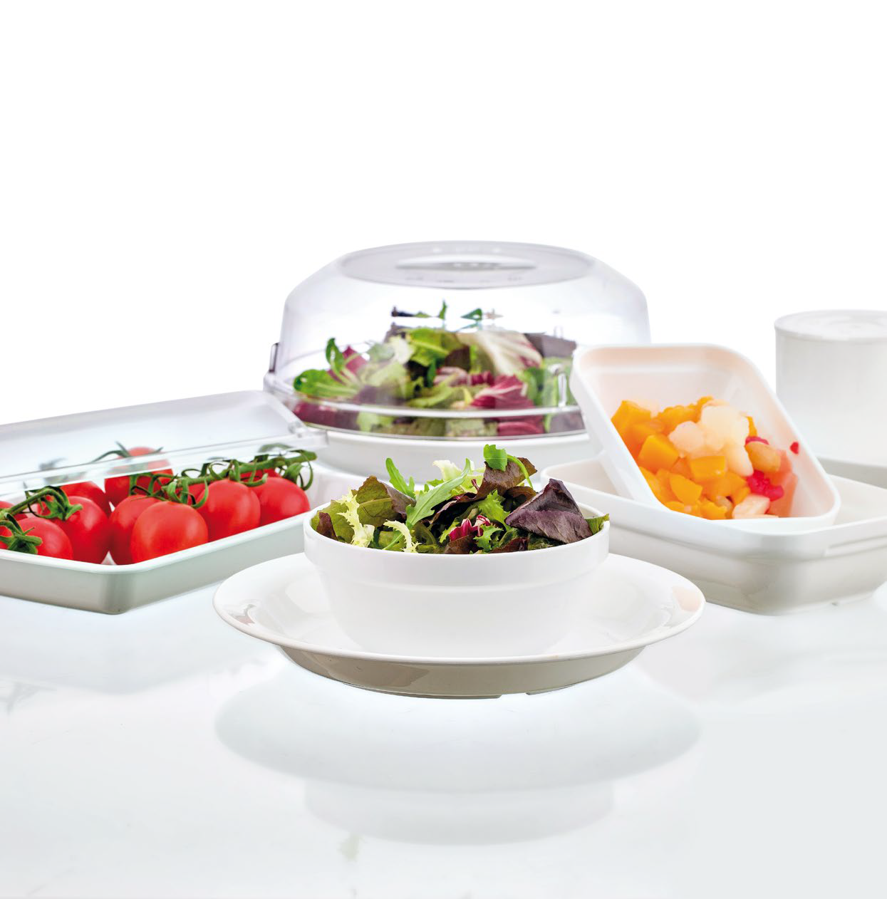 Vajillas de platos redondos y ovalados y/o con compartimentos, resistentes a arañazos, olores y manchas; con superficies texturizadas para que ensaladas y comidas duren más. Ideales para residencias, colegios, escuelas, guarderías y establecimientos hospitalarios.